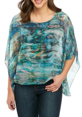 Fast delivery full service customer support. This cold-shoulder scarf top features a flattering silhouette with an elastic bottom and built-in jersey knit lining. A sheer overlay adds soft movement to this scarf top detailed with an ornate paisley print.