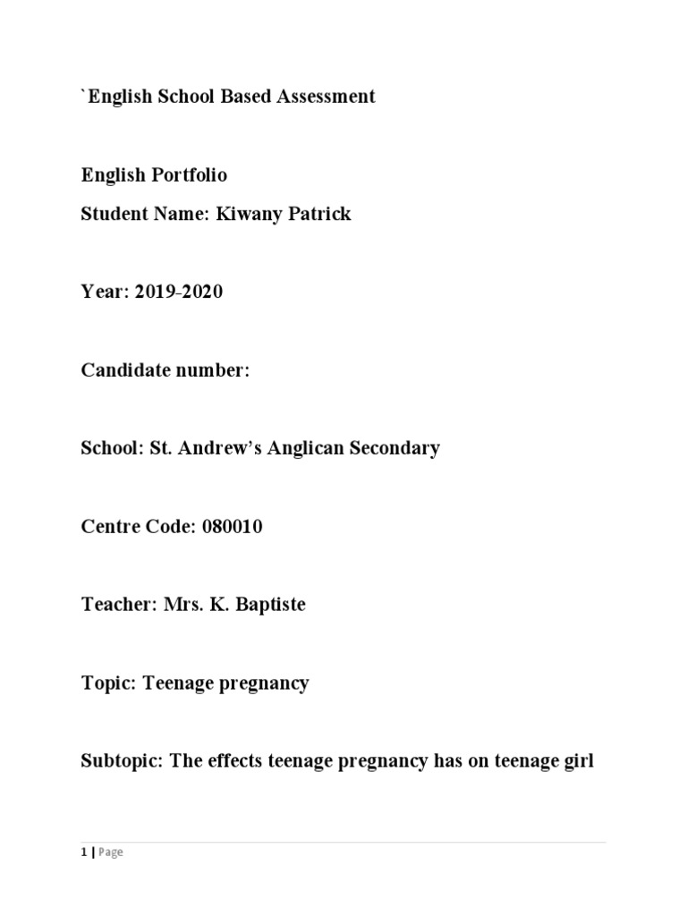 This song outline that getting pregnant has a teen is not a good experience for victim of teenage pregnancy as they are treated very badly by family members and those in there surrounding The third piece is a poem discussed all the problems the person encountered being pregnant as and the discouragement she face. English SBA Plan of Investigation About the POI Your Plan of Investigation is a 100 word summary which is worth 5 marks for your English SBA. Reflection 2 requires students to pay attention to the language that is used to convey meaning. Teenage gestation is a societal job that is non fixed by sexual instruction or abstention but an overall buildup of a individual to take a healthy life with a healthy ego esteem to do good picks in life. Become pregnant before the age 20 8 in ten of these are unintended and 80 are to unmarried teens. Teenage pregnancy among girls is never a good thing to deal with because it lessens the chance of the girl finishing school and enjoying her teenage years. I chose this topic because Im a teenage mother myself and I want to prevent other teens not to go through the struggles Im currently going through. Order custom essay Social Studies Teenage Pregnancy Questionnaire SBA with free plagiarism report. Giving birth to premature babies is another risk of teenage pregnancy that can emotionally affect the mother and lead to health risks for the baby.